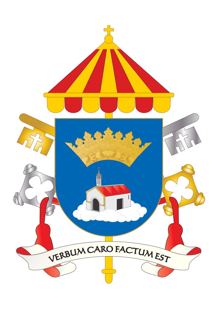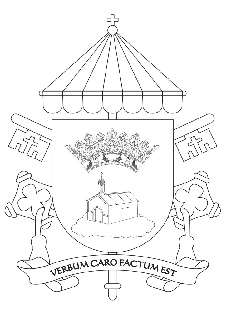 Ispod štita nalazi se ispisano geslo na latinskom jeziku: „Verbum caro factum est“, odnosno „Riječ je tijelom postala“ što je i prikazano u grbu u detalju vratiju na kućici.